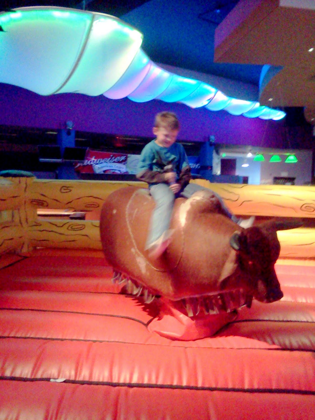 Then we took turns on the mechanical bull. Annalyn sat for about two seconds and when it started to move she had had enough of it. Nicholas stayed on for a long time.